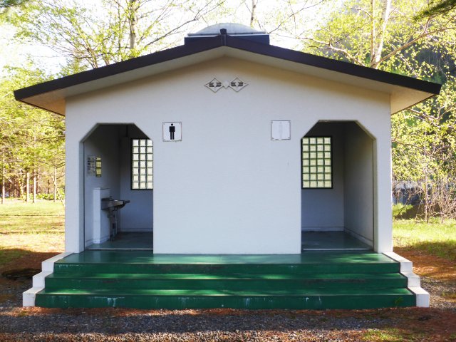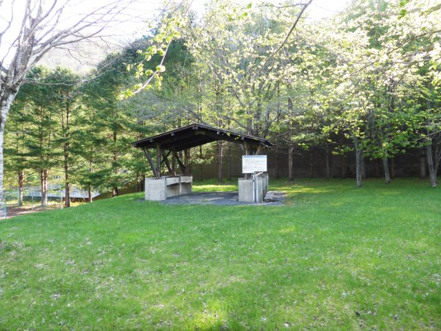 小而布满草地的露营地。位于水坝出水口的山脚是其特徵。